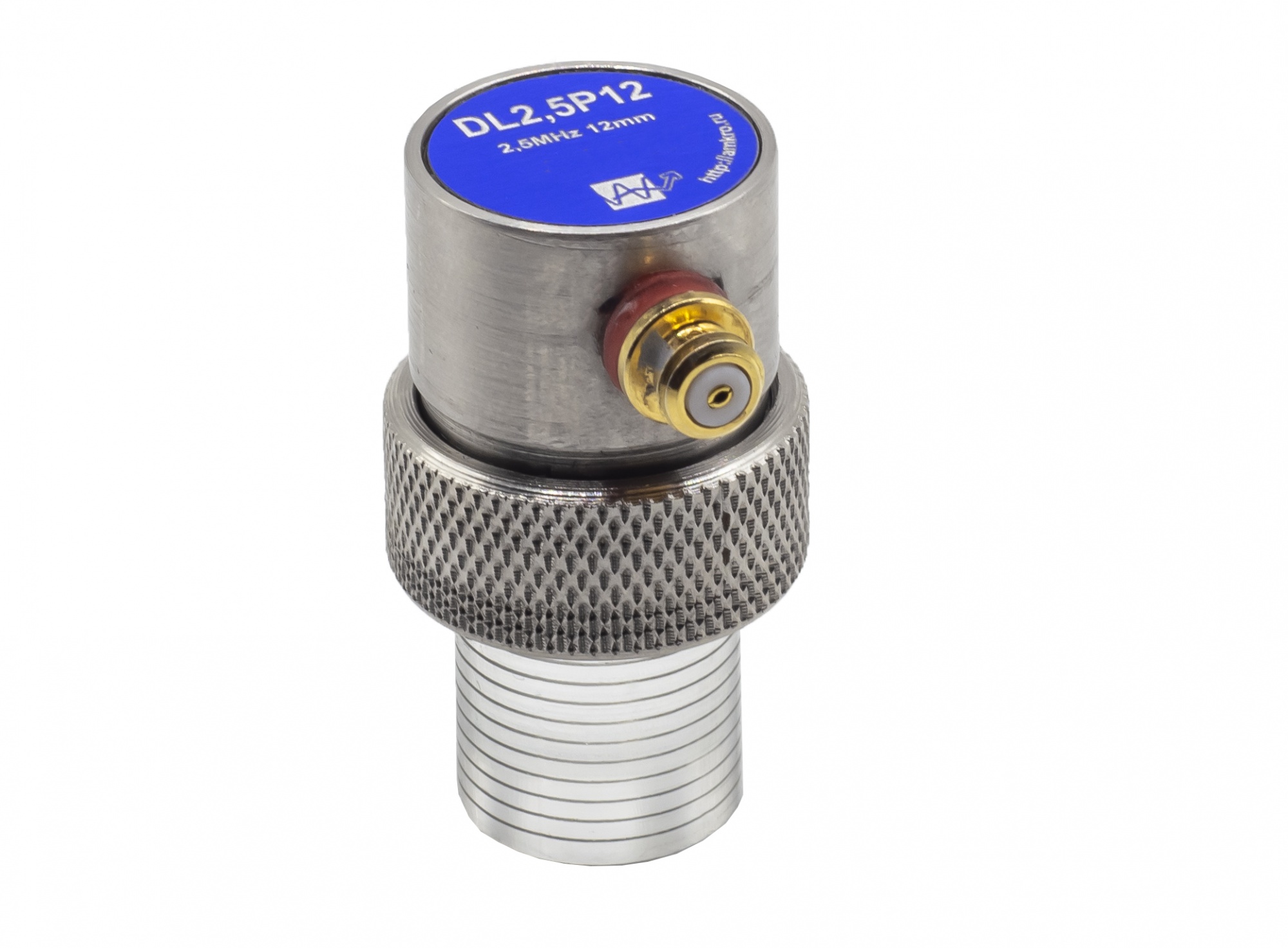 Преобразователь ультразвуковой DL2,5P12 (2,5 МГц) со сменной линией задержки. Предназначен для контроля толщины различных изделий  под лакокрасочными покрытиями, а также контроля точечной сварки, тонкостенных изделий и изделий сложной конфигурации.